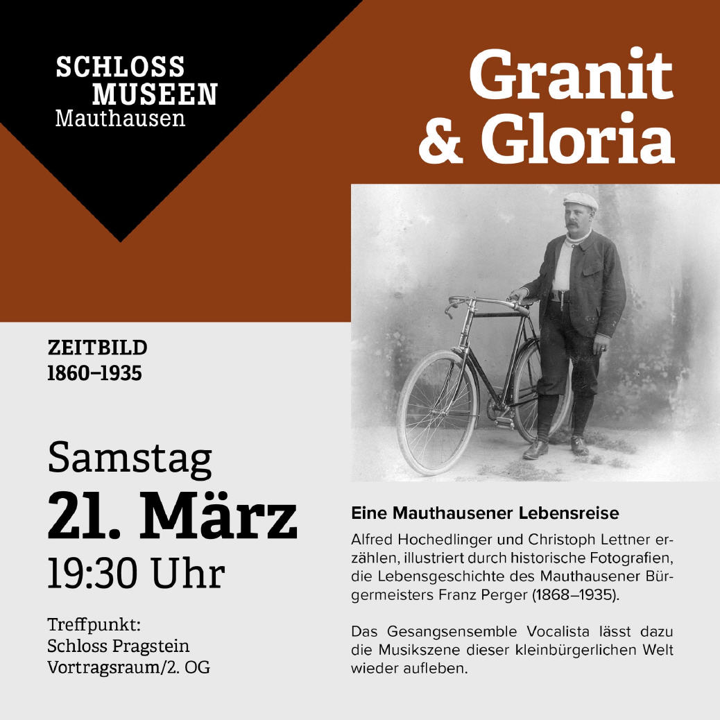 21.03.2026: Granit & Gloria. Zeitbild 1860–1935 Am Samstag, 21. März um 19:30 Uhr nehmen dich die Schloss Museen Mauthausen mit auf eine Mauthausener Lebensreise. Alfred Hochedlinger und Christoph Lettner erzählen. Illustriert mit historischen Fotografien. Im Mittelpunkt steht die Lebensgeschichte des Mauthausener Bürgermeisters Franz Perger. Dazu lässt das Gesangsensemble Vocalista die Musikwelt dieser Zeit wieder aufleben. Treffpunkt: Schloss Pragstein, Vortragssraum. 2. OG Komm vorbei. #mauthausen #schlosspragstein #schlossmuseen #geschichte #zeitreise #oberösterreich #vortrag #kultur