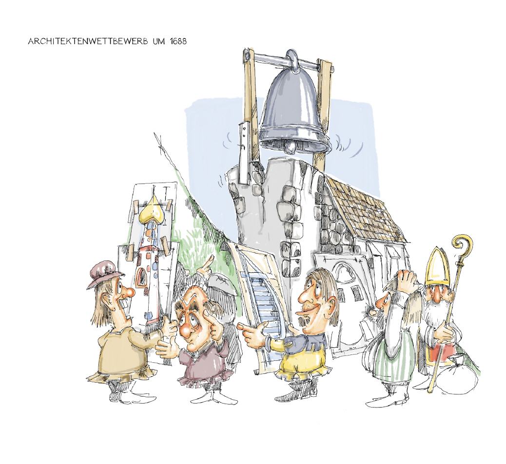 In diesem ‚mickrigen‘ Turm hatte sie keinen Platz. Es gab daher nur eine Lösung: Der Turm musste um eine Glockenstube erhöht werden. Also wurde er ausgebaut, bekam eine barocke Haube und wurde so zum Zwiebelturm mit einer nun schon respektableren Höhe von 42 Meter.
